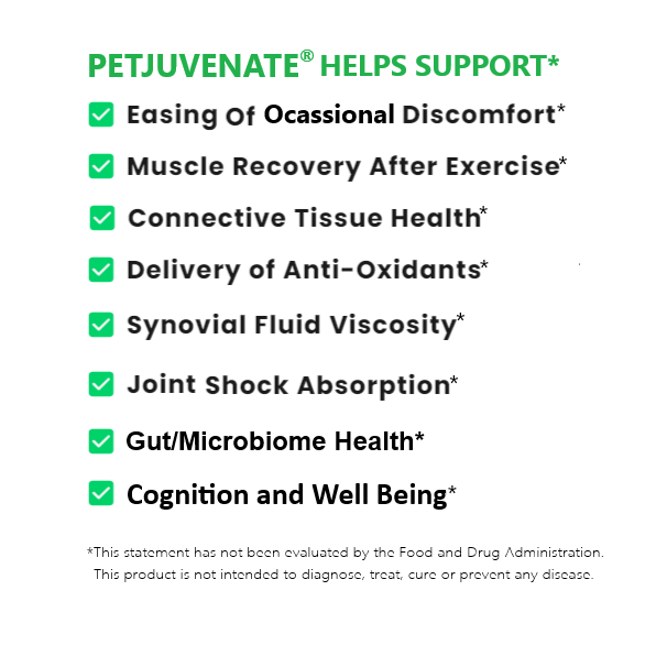PETJUVENATE® SUPPORTS HEALTHY JOINTS, GUT, EYES, SKIN/COAT, MOOD/COGNITION, AND MORE. TAKE OUR WORD FOR IT - TRY IT RISK FREE - IF YOU ARE NOT ABSOLUTELY DELIGHTED, RETURN IT - NO QUESTIONS ASKED