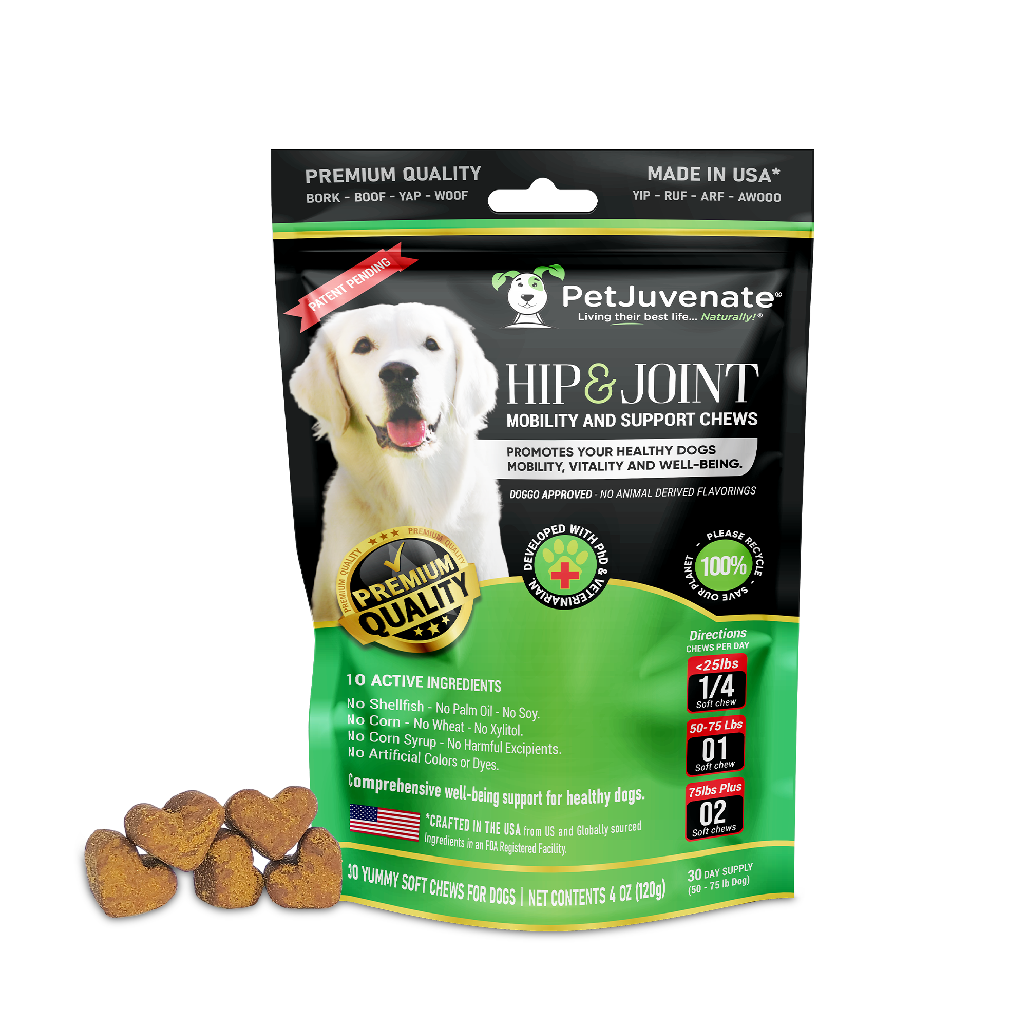 PETJUVENATE® SOFT CHEWS ARE MADE WITH PREMIUM INGREDIENTS RIGHT HERE IN THE USA WITH DOMESTIC AND GLOBALLY SOURCED INGREDIENTS IN AN FDA REGISTERED FACILITY THAT FOLLOWS GOOD MANUFACTURING PRACTICES (CGMP) CONSISTENT WITH HUMAN FOOD STANDARDS*